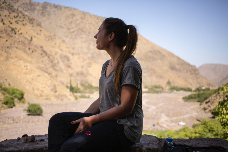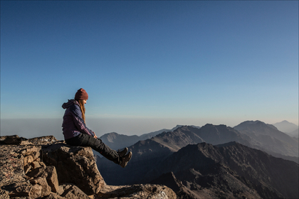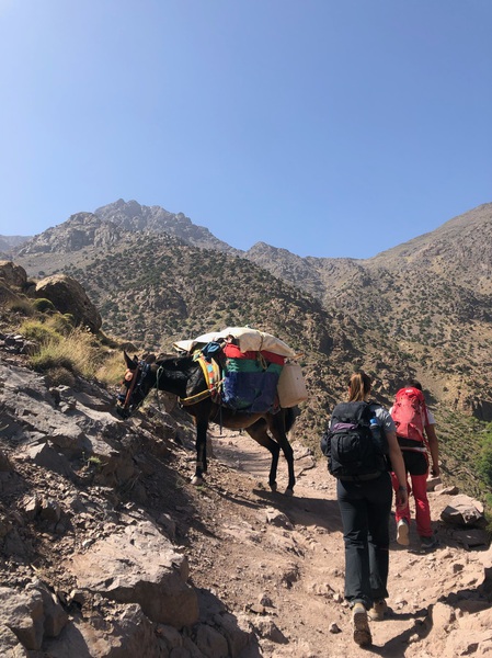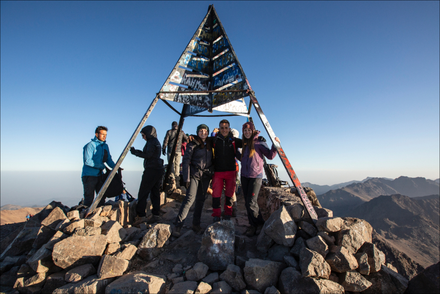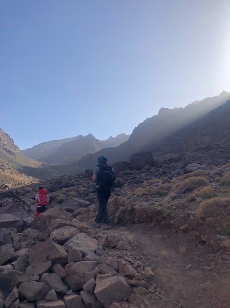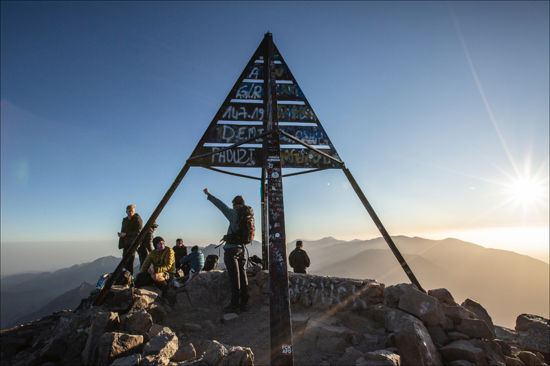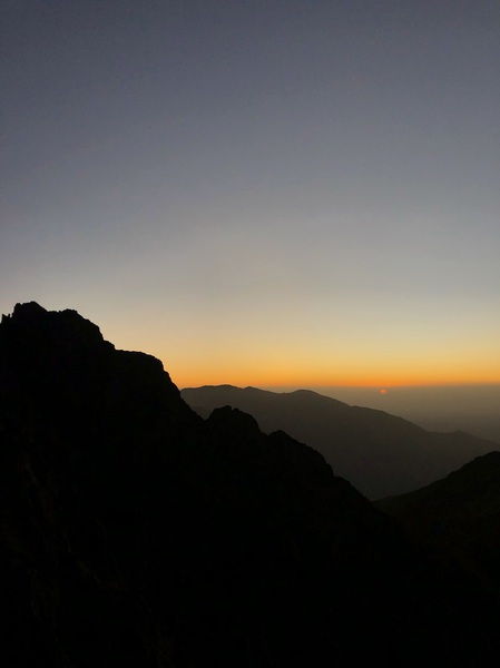 Nach diesen erlebnisreichen aufregenden ersten Tagen ging es für meine Cousine und mich in die Berge. Ich wollte unbedingt den Jbel Toubkal besteigen! Mit seinen 4167 Höhenmetern ist er der höchste Berg Nordafrikas und mein erster 4000er zugleich. Die Tour buchten wir im Voraus, inklusive Guide. Seitdem 2018 zwei Studentinnen in ihrem Zelt ermordet wurden, sollte man die Tour möglichst mit einem Guide gehen. Zu unserem Zeitpunkt ging es auch gar nicht anders. Auf unserem Weg zum Gipfel übernachteten wir im Refuge, das auf 3207m lag. Von dort aus brachen wir am nächsten Morgen sehr früh auf, um bei Sonnenaufgang oben am Gipfel zu stehen. Auch wenn es aufgrund der dünnen Luft sehr langsam und mühselig voran ging, wurden wir mit einer unglaublichen Aussicht oben belohnt.
